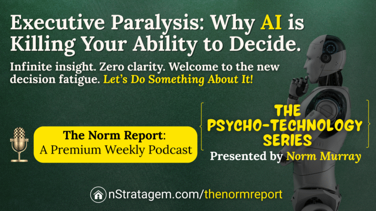 In this gripping episode of The Norm Report – Psycho-Technology Series, Norm Murray dissects a hidden crisis in the C-suite: how AI, with its endless forecasts and algorithmic certainty, is quietly eroding executive confidence. From predictive overload to optimization traps, today’s leaders face a silent epidemic of indecision, and most don’t even know it’s happening.